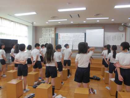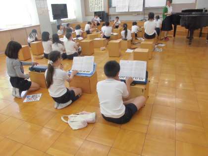 音楽では、最初に発声練習をします。どんどん音階があがっていき、そしてまた下がるというような練習をしています。発生練習後の「おぼろ月夜」の歌声もとてもきれいでした。「木星」の合奏の練習もがんばっています。