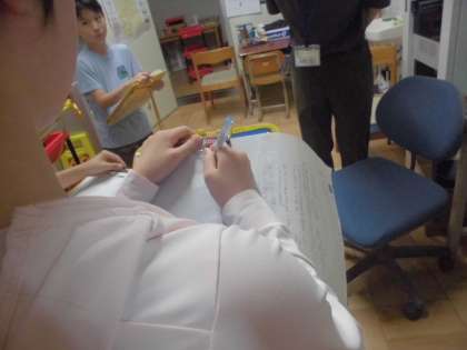 国語の「聞いて、考えを深めよう」の学習でインタビューをしています。自分の考えと比べながら聞き、新たな気付きや共感を取り入れるなどして考えを深めることを目標にして、管理用務員さんにお話を伺いました。