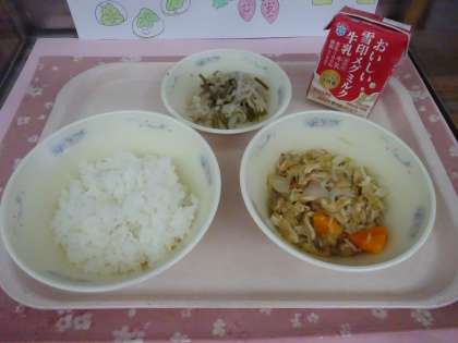 今日の給食は、ごはん・牛乳・油あげのチャンプル・クーブイリチーでした。沖縄にちなんだ献立でした。