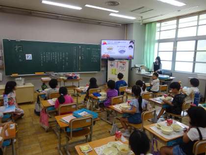 沖縄の料理についてのムービーも見ました。沖縄の方言で「おいしい」は「マーサン」といいます。いろんな教室から、「今日の給食、マーサン!」という声がありました。沖縄に行った気分で楽しく食べました。