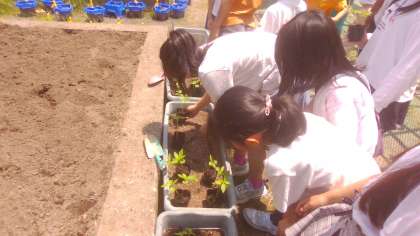 理科の学習では、地域の方に協力していたただいて、ホウセンカとひまわりを植えました。どのように植えると植物の間を開けることができるか地域の方にアドバイスを頂きながら植えることができました。