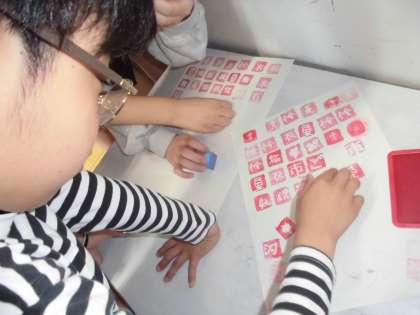 図工で「オリジナルはんこ」をつくりました。自分の名前のうちの一文字を選んでスチレンボードに描きました。みんなそれぞれ自分だけのはんこをつくりました。