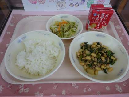 今日の給食は、ごはん・牛乳・肉みそいため・ごま酢煮でした。