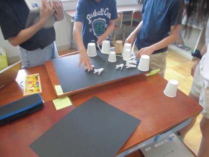 土曜参観の図画工作で「形に命をふきこんで」という学習をしました。今回は、班で協力してGIGA端末を使ってコマどりアニメーションを制作しました。同じ材料でもいろいろな工夫がされていて、とても楽しいアニメーションができあがりました。