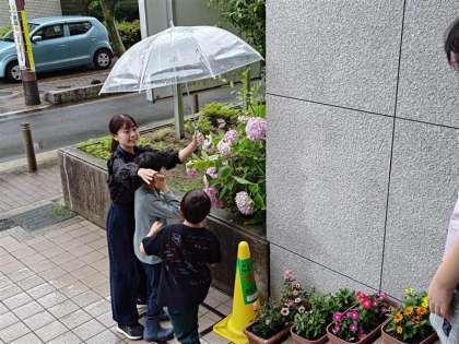 雨が降っている中、梅雨の季節を感じ、アジサイの色を確認しました。