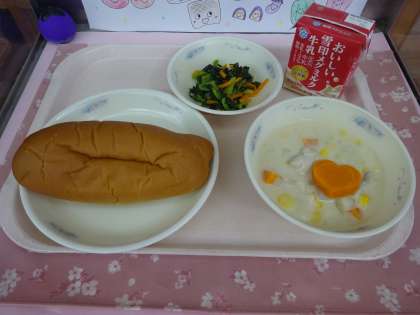 今日の給食は、黒糖コッペパン・牛乳・コーンのクリームシチュー・小松菜のソテーでした。