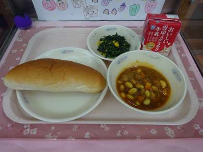 今日の給食 公開日 2025/06/24 更新日 2025/06/24 ぱくぱく通信 今日の給食は、ミルクコッペパン・牛乳・チリコンカーン・ほうれん草のソテーでした。 チリコンカーンはアメリカの料理です。給食では、牛ひき肉と大豆を使っています。スパイシーな味となるように、カレー粉を使っています。ピリッと辛く、パンともよく合います。今日もごちそうさまでした!