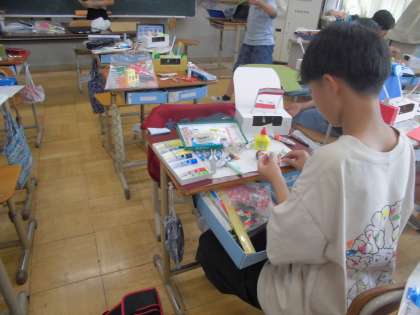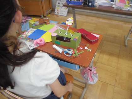 図工では「くるくるクランク」の学習をしています。クランクのしくみをいかして、動くおもちゃをつくっています。きちんと動くかどうか確かめながら飾り付けなどもしています。来週1時間で仕上げをして、鑑賞する予定です。