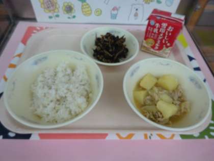 7月7日(月)の給食は、麦ごはん・牛乳・肉じゃが(ピリカラみそ味)・ひじきの煮つけでした。
