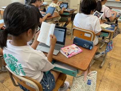 5年生 国語科「作家で広げるわたし達の読書」 公開日 2025/07/10 更新日 2025/07/10 5年生のページ お気に入りの筆者の本を紹介します。読んできた本で面白いと思ったことをGIGA端末を使って紹介カードに書き表しています。