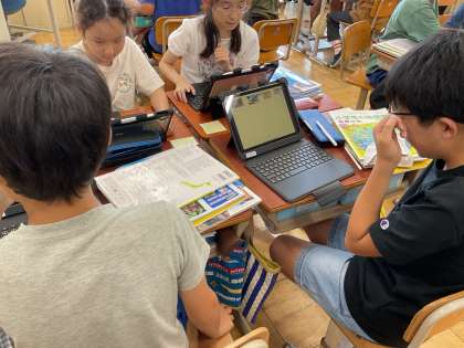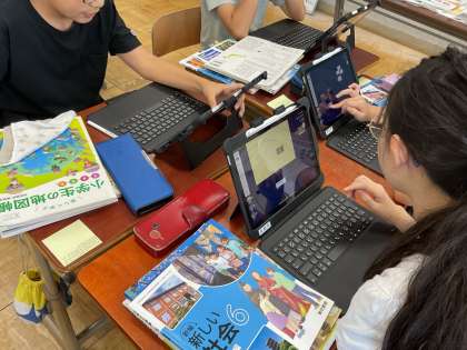 社会では「武士の世の中へ」の学習をしています。今日は、自分で資料を選び、武士とはどんな人なのかをその資料から考えました。ロイロノートの共有ノートや、デジタル教科書も使い、グループで交流しました。そして学習問題をつくりました。