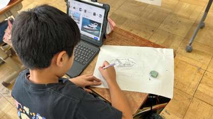 5年生 図画工作科〜言葉から思いを広げて〜 公開日 2025/09/03 更新日 2025/09/03 5年生のページ 図画工作科ではお話の絵に取り組んでいます。今日はアイデアスケッチを描きました。物語から思いを想像して描き広げています。