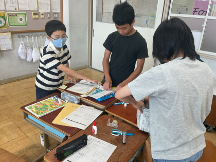 ゆとりをもって物を出し入れしやすいナップザックを作るために、どのような工夫をすればいいか話合いました。話し合いながら新聞紙でかばんを作り、ナップザック作りに生かせそうなことを見つけていました。