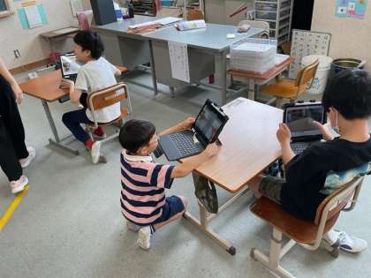 【おひさま】タブレットで動画を撮る練習をしました 公開日 2025/09/11 更新日 2025/09/11 おひさま学級 生活科・総合的な学習の時間では、地域のデイサービスについて学習をしています。 デイサービスの利用者さんに小学校を紹介するために動画を撮ることになりました。 教室の中を撮る練習をして、慣れることができました。