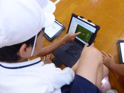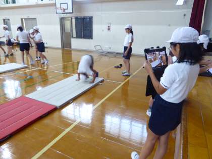 体育はマット運動の学習に取り組んでいます。GIGA端末を使い、お手本の動画と見比べて上手になるコツを考えていました。