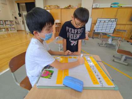 今週は敬老の日がありました。生活科・総合的な学習の時間で、地域のデイサービスセンターを訪れ、お年寄りを楽しませる会を開くことになりました。その名も「みんなのえがお大さくせん😊」です。この会の中で、お年寄りに新町小学校のことを紹介することになりました。動画に撮り、クイズ形式にして、一緒に見ます。グループに分かれて、動画を撮るため、グループで動画やクイズの内容を話し合っています。