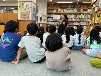 3年生 国語科「ちいちゃんのかげおくり」 公開日 2025/10/01 更新日 2025/10/01 3年生のページ 図書館司書に「ちいちゃんのかげおくり」の読み聞かせをしていただきました。事前に物語に出てくる言葉を説明していただき、お話を聞くことができました。