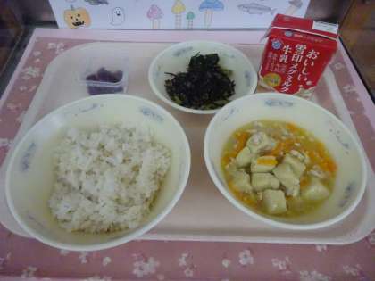 今日の給食は、麦ごはん・牛乳・高野どうふのそぼろ煮・小松菜とひじきのいためもの・しば漬でした。