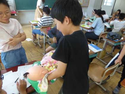 ヒトが生まれてきたときどのような様子なのか。赤ちゃんの人形を使って体験を通して学習をしました。