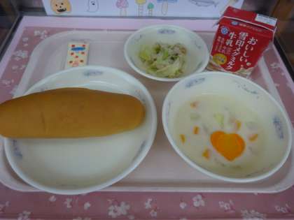 今日の給食は、コッペパン・牛乳・ツナサンド(具)・マヨネーズ・白いんげん豆のチャウダーでした。