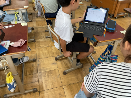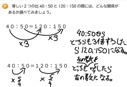 6年生 算数 公開日 2025/10/08 更新日 2025/10/08 6年生のページ 算数は「比とその利用」の学習をしています。a:bの両方の数に同じ数をかけたり、両方の数に同じ数でわったりしてできる比が、すべてa:bに等しくなることを交流しながら学びました。
