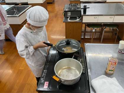 まず、おひさま畑で育てて収穫したポップコーンの種を50グラム量りました。そして、フライパンで炒めると次々とポップコーンが出来ていきました。