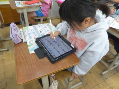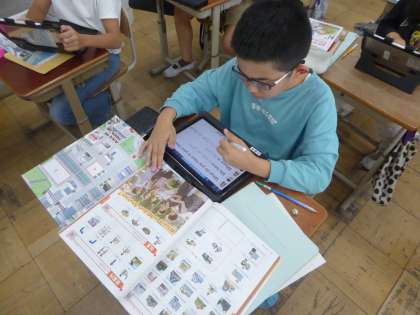 町にある施設の紹介カードを作っています。町にある施設や欲しい施設など思い思いにGIGA端末に書き込んでいます。外来語を使ってその施設にまで道案内をしてもらおうと思います。