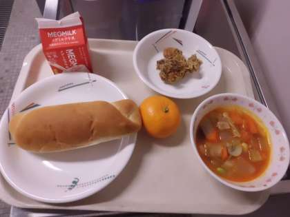 ミルクコッぺパン・牛乳・スパイシーチキン・ミネストローネ・みかん