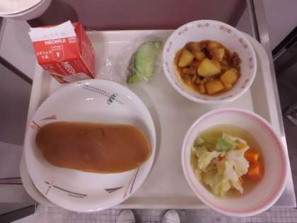 黒糖コッぺパン・牛乳・豚肉のケチャップ煮・野菜のスープ煮・メロン
