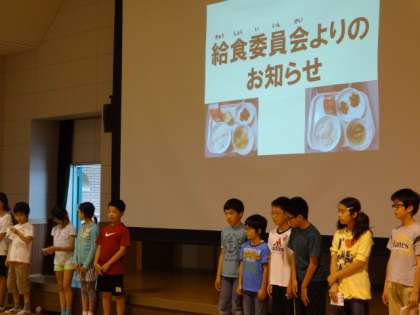 6月は,食育月間です。今日の朝会では,給食委員会のメンバーが,給食のときにみんなに気をつけてほしいこと,大事にしてほしいことなどを伝えてくれました。