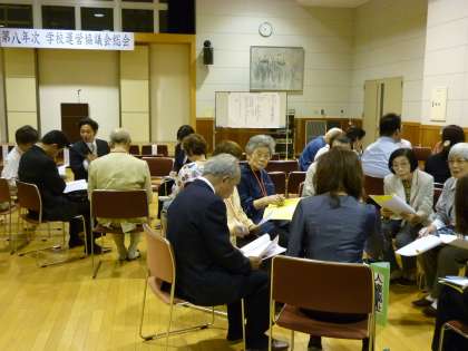 9年目を迎えました「新町小学校運営協議会」は,5月24日に行われた総会を皮切りにスタートしました。理事をはじめ委員さんと合わせて90名出席していただきました。総会終了後には、7つの企画推進委員会が行われ,委員毎に反省点や今年度の取組に向けての抱負などが話し合われました。新たな気持ちで推進していくことを参加者全員で確認し合いました。