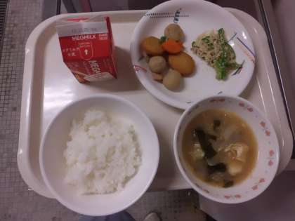 ご飯・牛乳・平天と里芋の煮つけ・糸こんにゃくのたらこまぶし・みそ汁