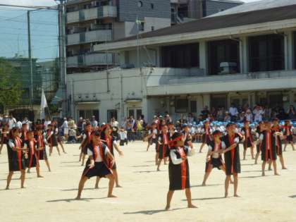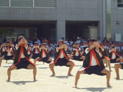 午前の部を締めくくる4年生の団体演技「創作炭坑節」軽快な音楽が始まる前の構えは,腰を低くして,さあやるぞ!という気持ちが表れていました。踊りも一つ一つ習ったのを思い出しながら頑張っていました。ハァッと言う声も元気があって効果的でした。最後の決めも格好よかったです。