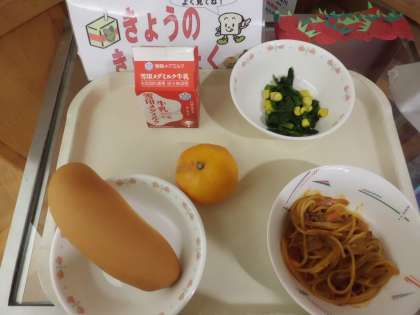 小型コッぺパン・牛乳・スパゲティのミートソース煮・ほうれん草のソテー・冷凍みかん