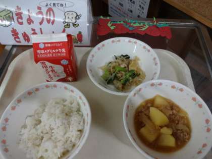 麦ごはん・牛乳・じゃがいものそぼろ煮・小松菜と切干し大根の煮びたし