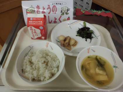 麦ごはん・牛乳・鶏肉のさっぱり煮・小松菜とひじきの炒め物・みそ汁