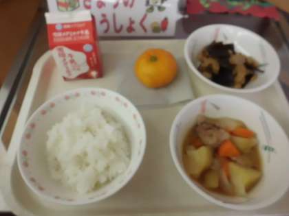 ごはん・牛乳・鶏肉と野菜の煮つけ・五目煮豆・冷凍みかん