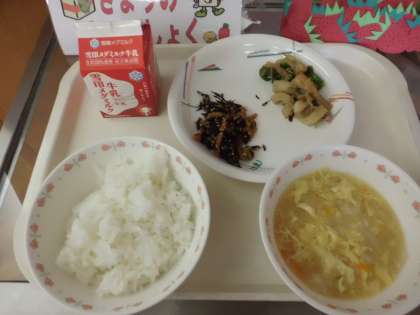 ご飯・牛乳・ひじきご飯の具・伏見唐辛子とじゃこの炒め煮・キャベツのかきたま汁