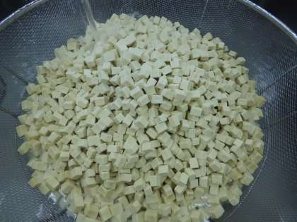 高野豆腐(こうやどうふ)とは、豆腐を凍結乾燥させた保存食です。乾燥状態では軽く締まったスポンジ状で、これを水で戻し、だし汁で煮込むなどして味を付けます。冬の寒い日に豆腐を屋外に放置してしまったことから、偶然に製法が発見されたと言われています。高野山で作られて精進料理の1つとして全国に広まり「高野豆腐」と呼ばれるようになったそうです。地域により「凍り豆腐(こおりどうふ)」・「氷豆腐(こおりどうふ)」・「凍み豆腐(しみどうふ)」・「ちはや豆腐」とも呼ばれています。