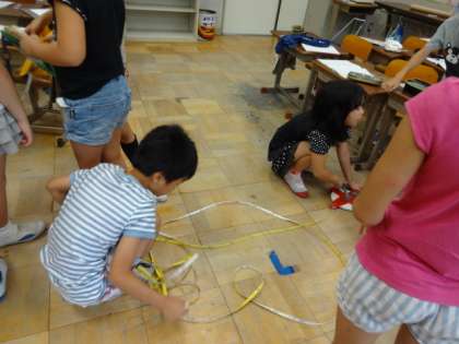 3年生が,巻き尺を使って,教室や廊下の,ものさしでは測れない長い長さを測りました。