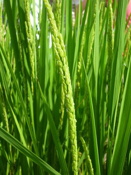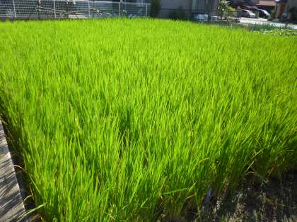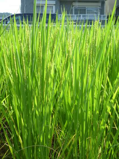 5年の田んぼの稲の穂に花が咲きました。きっと立派なお米に変身してくれると思います。それも,毎日食育企画推進委員の方や理事の方が,水はあるか,育っているか,暑い日も毎日のように見守っていただいたおかげです。ありがとうございました。