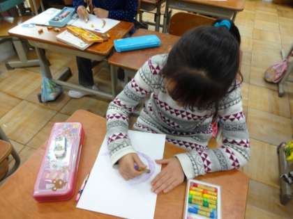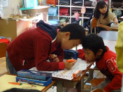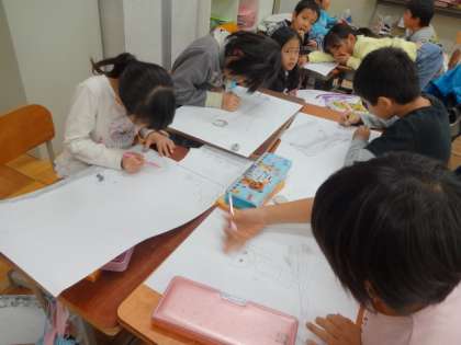 とれたさつまいもを,みんなでおいしくいただこう,そのとき,おいもがたくさんとれたお祝いに,みんなで楽しく遊ぼうと,ただ今,準備のまっ最中です。1組・2組の枠を取り払って,同じめあてのお友だちがグループを組み,知恵と力を出しあいながら,ワイワイと活動しています。どんなパーティになるのでしょうか。