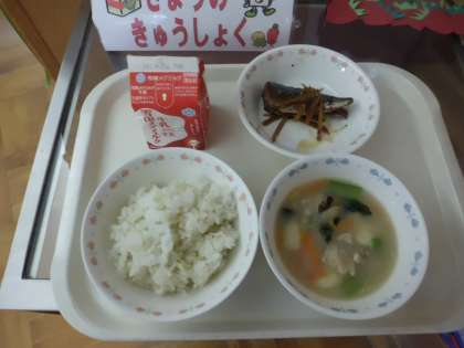麦ご飯・牛乳・さんまのかわり煮・ふわふわだんご汁
