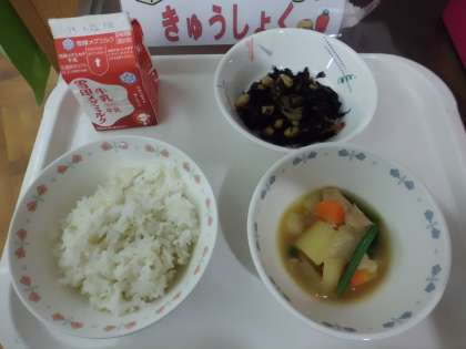 2月19日(木) 今日の給食 公開日 2015/03/05 更新日 2015/03/05 ぱくぱく通信 ☆☆☆ 今日の献立 ☆☆☆ 麦ご飯・牛乳・鶏肉と野菜の煮つけ・ひじき豆 「ひじき豆」は京都のおばんざいの一つです。 もどしたひじきと大豆・油揚げ・にんじんを出汁でトコトと煮ています。