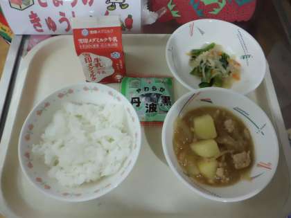 ごはん・牛乳・じゃがいものそぼろ煮・小松菜と切り干大根のに煮びたし