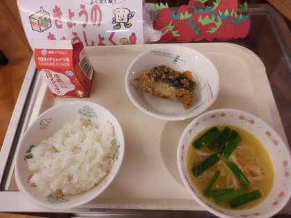 1年生がみつば幼稚園年長さんと交流給食をしましたが来ていた幼稚園児も「すごくおいしい。1年生になるのが楽しみ」と言ってモリモリ食べていました。とっても嬉しい一言です。