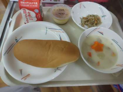 味付けコッぺパン・牛乳・じゃがいものクリームシチュー・ごぼうのソテー・プリン