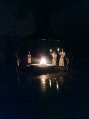 今年のみさきの家でのキャンプファイヤーは,プレイホールで行われました。真っ暗になったプレイホールに,火の子をしたがえて火の神が現れました。火の神は,さまざまな灯を4年生に授けてくれました。その灯は,一生忘れられない明るい炎となって,歩いていく道を照らしながら,子どもたちの心の中に輝き続けていくことでしょう。