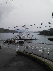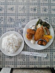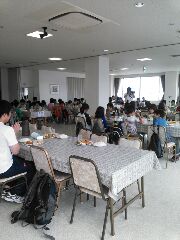 4年生は,レストランフェリーに到着し,待望の昼食をとっています。発車と同時にバスの中で寝ていた子どもたちも起こされて,昼食の海老フライ定食に大喜びです。船をバックに,景色を楽しみながらランチをしています。