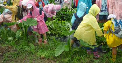 さつまいもの成長を願い,みんなで協力してさつまいもの周りの草を抜きました。畑の先生,地域の方にもご協力頂き,みんな頑張って活動を行っていました。